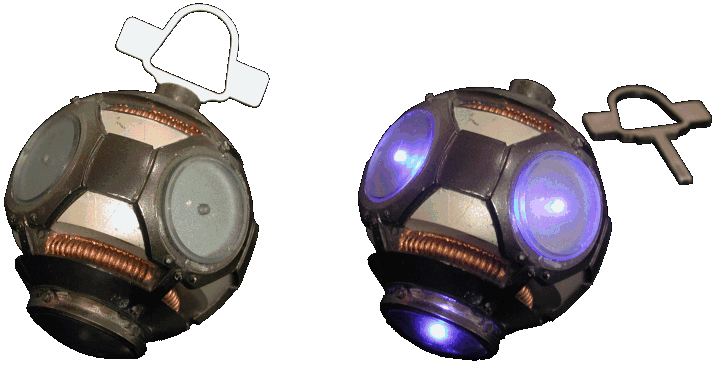 This is UV bomb prop features intervalled lighting and a plug for recharging.